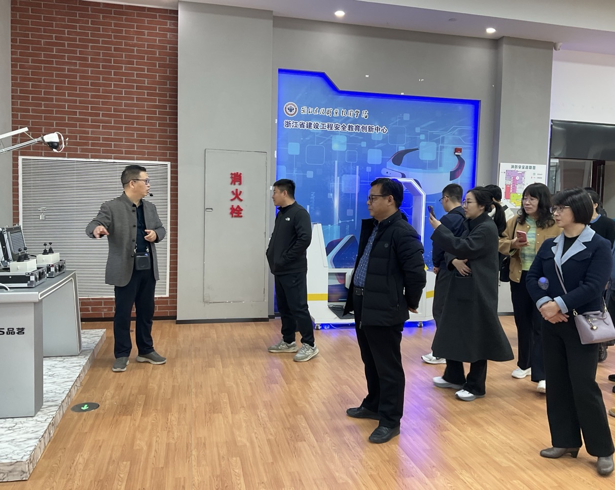 23日上午,团队赴浙江建设职业技术学院考察。在“浙里建·未来建造中心”,基于BIM数字孪生技术的施工模拟系统、无人机测绘及装配式建筑3D打印技术,全景展示智能建造创新应用;在浙江省建设工程安全教育创新中心,1:1隐患模拟场景、消防逃生实训及智能监测系统,通过“虚实结合”构建了可复制的实践教学体系。李勇表示,该院“场景化、任务化、项目化”教学模式为优化我院专业课程设计提供了重要参考。