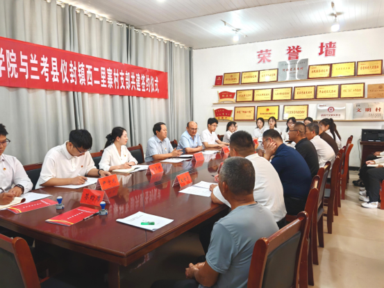 为深入贯彻党的二十大精神,落实习近平总书记关于“三农”工作的重要论述,充分发挥高校学科专业优势与乡村资源禀赋以及高校与农村基层党组织的优势,加强校地合作,以党建引领助力乡村振兴战略的实施。2025年6月11日,milan米兰官网学工党支部与兰考县仪封镇西二里寨村党支部举行支部共建签约仪式。milan米兰官网党委委员、副校长常新中、milan米兰官网党总支书记张虎、milan米兰官网学工党支部书记刘亚娟,仪封镇政法委员曲永辉、副镇长宋冲亚及支部成员出席活动,西二里寨村支部书记王世通主持会议。