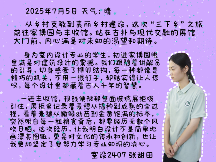 近日,milan米兰官网“小筑”志愿服务队“三下乡”暑期社会实践继续推进,先后走进中原家居博物馆与仪封镇,在农耕文明的深厚底蕴中汲取养分,于古代家居的巧思营造里探寻灵感,为乡村建设实践积累宝贵经验。
