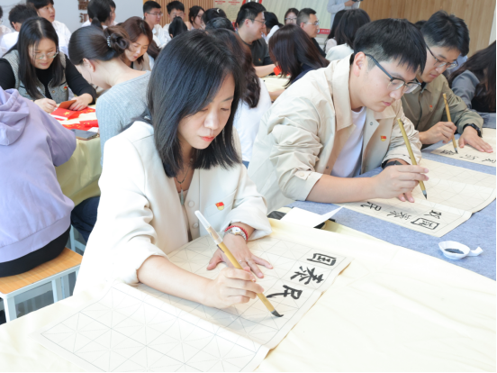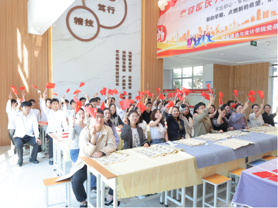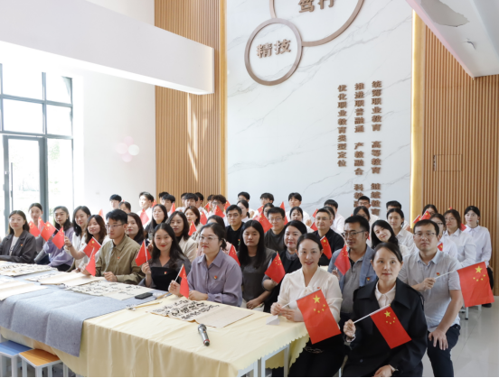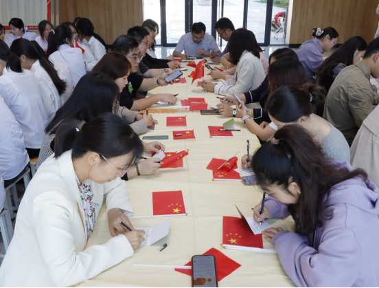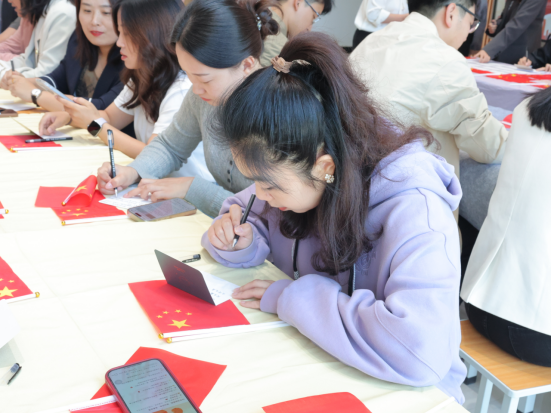 在“一封家书寄相思”书信环节,党员教师们提笔伏案,将双节感悟、工作心得与党员担当融入文字,或向家人诉说牵挂祝福,或分享身为党员的责任坚守,字里行间尽显“爱国爱家相统一”的赤诚。活动中,部分党员教师朗读家书片段,真挚的情感引发全场共鸣,生动诠释了共产党员“舍小家为大家”的奉献精神。“书法大赛——向祖国表白”环节现场墨香四溢。党员教师将党建金句、爱国诗句及节日祝福跃然纸上。一幅幅笔力遒劲的书法作品,既是对中华优秀传统文化的传承,更是对祖国母亲的深情告白。在“歌唱快闪——礼赞祖国”环节,全体党员教师和学生代表挥舞国旗齐声合唱《我和我的祖国》《歌唱祖国》《没有共产党就没有新中国》等经典曲目,将活动推向高潮。