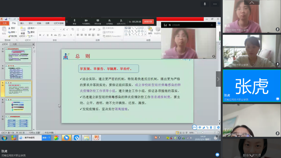 刘高喜老师就学生管理及宿舍管理提出八点措施:一是辅导员向学生们做好防疫措施宣传;二是楼道、楼梯扶手、门把手,以及公共卫生间的消毒;三是宿舍内通风(每天3次,每次30分钟以上),但是现在春天温差大,注意防止感冒,勤晒被褥,室内生活垃圾及时清理;四是宿舍备巴氏消毒液(一天消毒一次),备温度计(一天三次测体温);五是学生回到宿舍先洗手(七步洗手法—内外夹攻大力丸);六是如果学校不让学生在食堂吃饭,在宿舍吃饭时,两个人要保持一定的间距,吃完饭垃圾要及时处理;七是宿舍间不要串门,尽量少在楼道里走动;八如果宿舍内有人体温异常、咳嗽、乏力或咽痛时,抓紧上报辅导员(晚上时,要先报楼管和值班老师)。