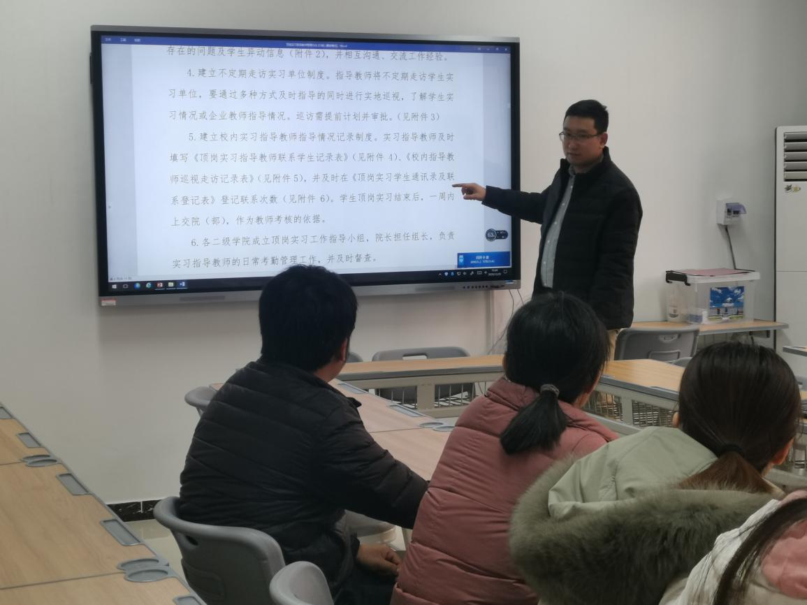 根据《教育部等五部门关于印发< 职业学校学生实习管理规定>的通知》(教职成〔2016〕3号)文件精神和《milan米兰官网顶岗实习管理办法》豫应职院院字〔2017〕72号文件要求,为切实保障我院2018级顶岗实习学生工作的稳定运行。2020年12月29日下午,milan米兰官网召开了2018级顶岗实习指导教师工作会议,milan米兰官网副院长娄焕、教务办公室主任任旭凯及18级顶岗实习指导教师参加了本次会议。