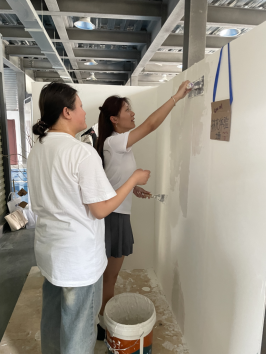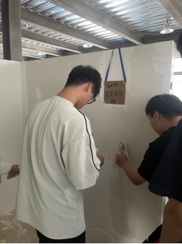 在任课教师韩晓芳的指导下,学生深刻掌握了轻钢龙骨石膏板隔墙的基本构造、安装以及石膏板的固定方法。实操环节,韩晓芳亲自示范刮腻子,并让学生们亲自动手体验。