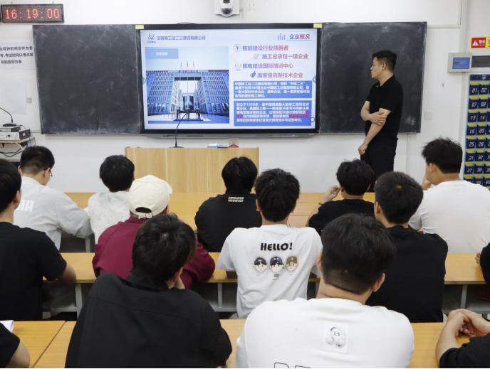 宣讲会上,中国核工业二三建设有限公司人力资源部负责人首先介绍了企业发展历程、业务布局及行业使命。作为我国核工业建设领域的骨干力量,公司深耕核电工程建设、核设施运维、新能源工程、工业与民用建筑等核心业务,参与了国内多个重大核电项目及新能源基地建设,具备全产业链服务能力与顶尖技术实力,其业务领域与学院智能建造、建筑设计等专业人才培养目标高度契合。负责人结合核电工程建设案例,讲解了智能建造技术在核工业领域的应用场景,以及行业高标准、严要求的发展特性,让学生直观认识核工业建设的重要意义与发展前景。