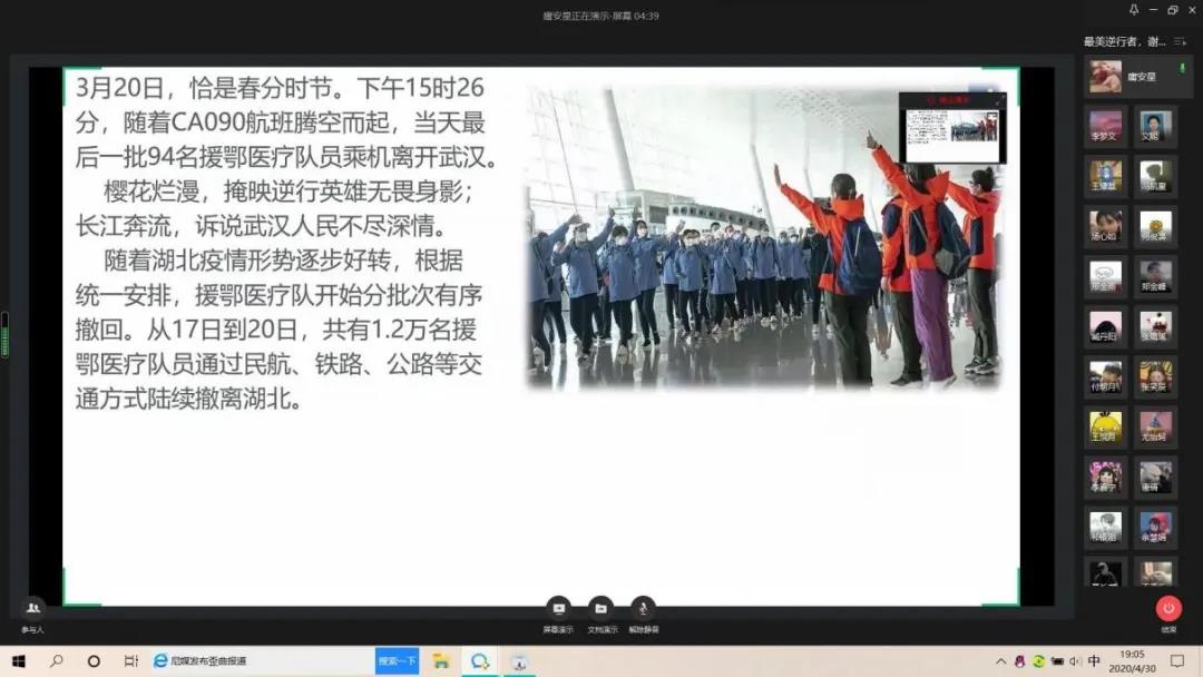 各团支部利用线上网络视频会议,线上集体讨论等学习方式,组织团员青年认真学习最美逆行者,各省援鄂医疗队有序撤离武汉,团员青年们从他们身上学习到他们是白衣天使,但他们更是普通人。他们近距离与病毒搏斗,马不停蹄地把一个个病人从死神手里抢回,日日夜夜的忙碌却从没有压垮过任何一个坚强的他们。我们在过年,而这些白衣天使却在帮我们过关。他们舍小家为大家,是时代的骄傲,是民族的骄傲,是国家的骄傲。他们是白衣天使,更是白衣战士。他们都是伟大的逆行者!