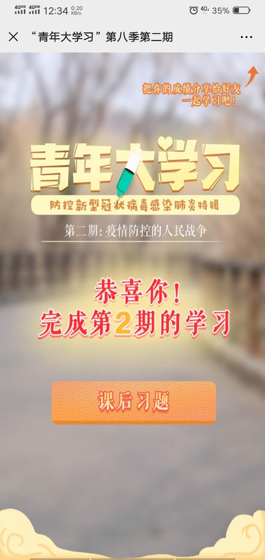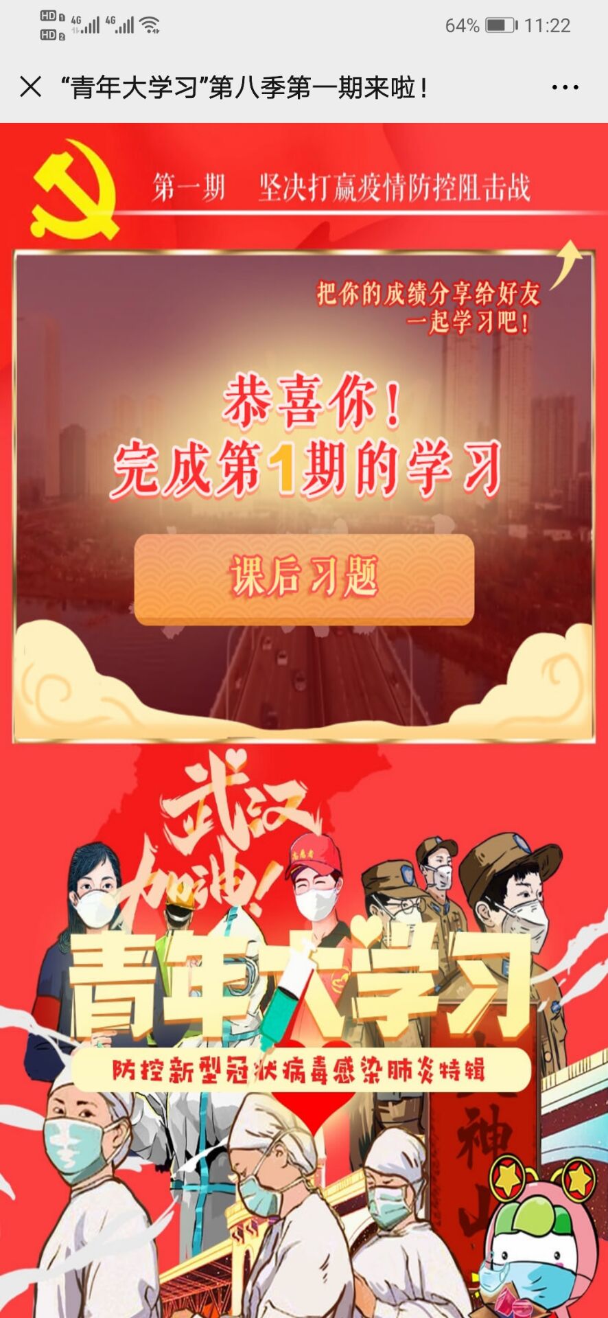 为贯彻落实习近平总书记重要讲话,教育广大学生正确认识疫情,增强学生对疫情的防范知识,2020年2月17日,青年大学习第八季关于防控新型冠状病毒感染肺炎特辑开课了,milan米兰官网团总支18级、19级共计31个团支部1078名青年学生参与并完成青年大学习第一期和第二期网上学习和答题活动。