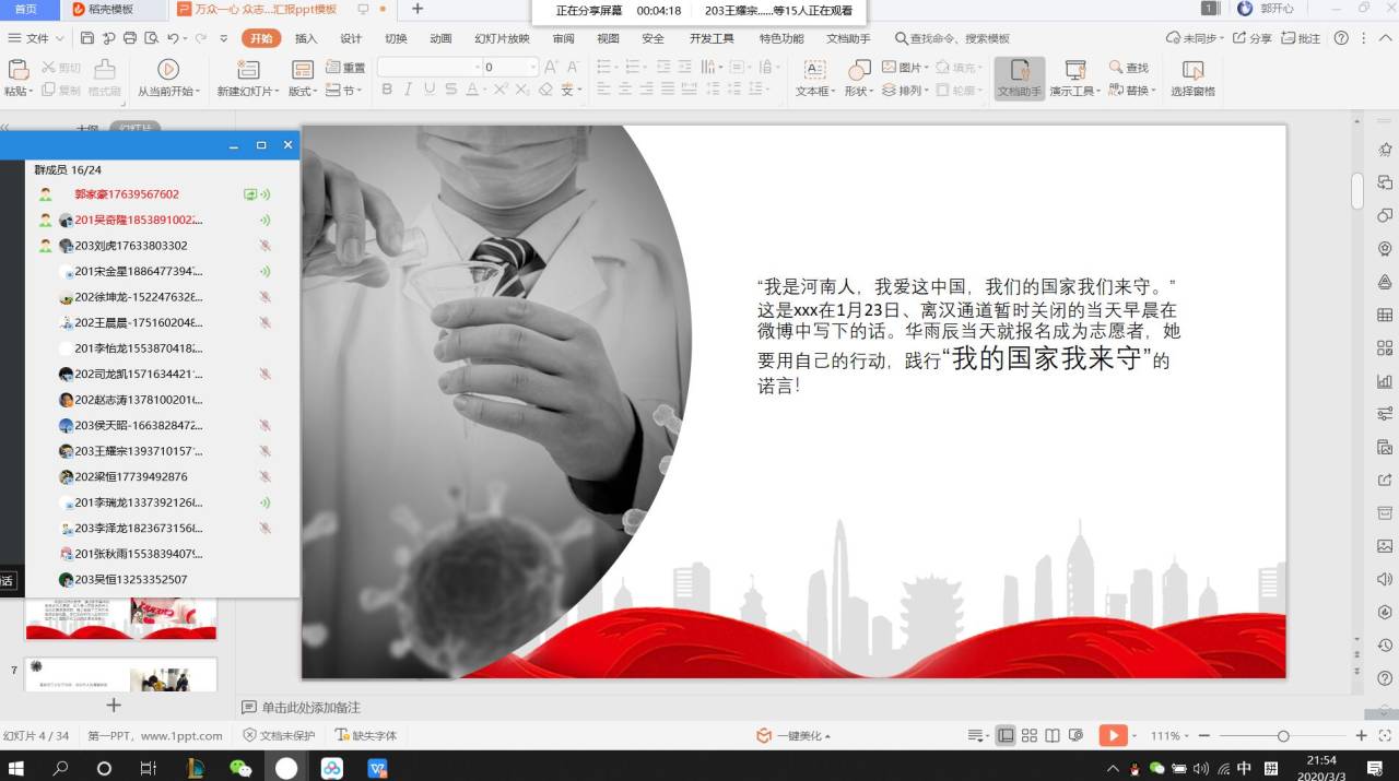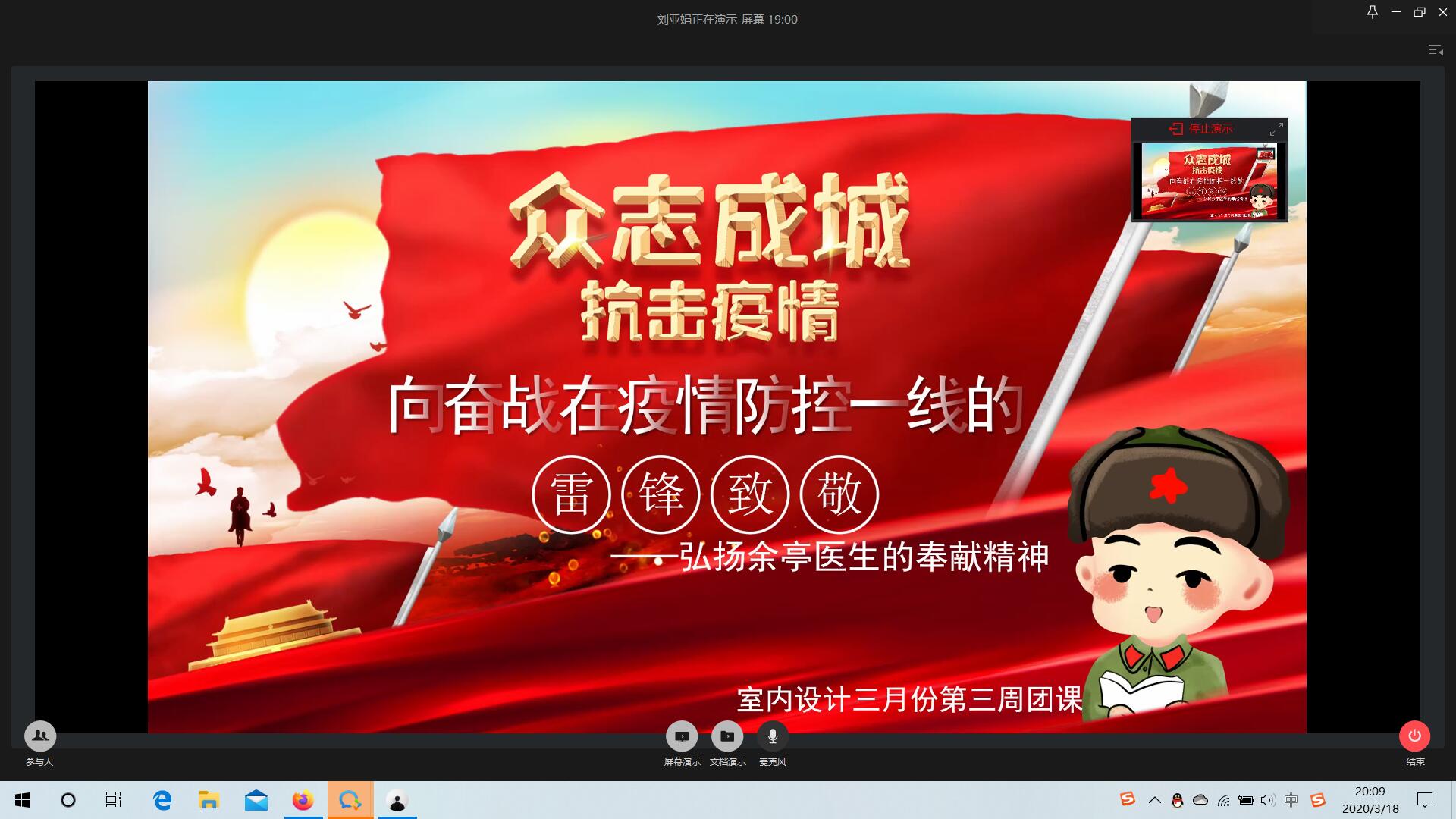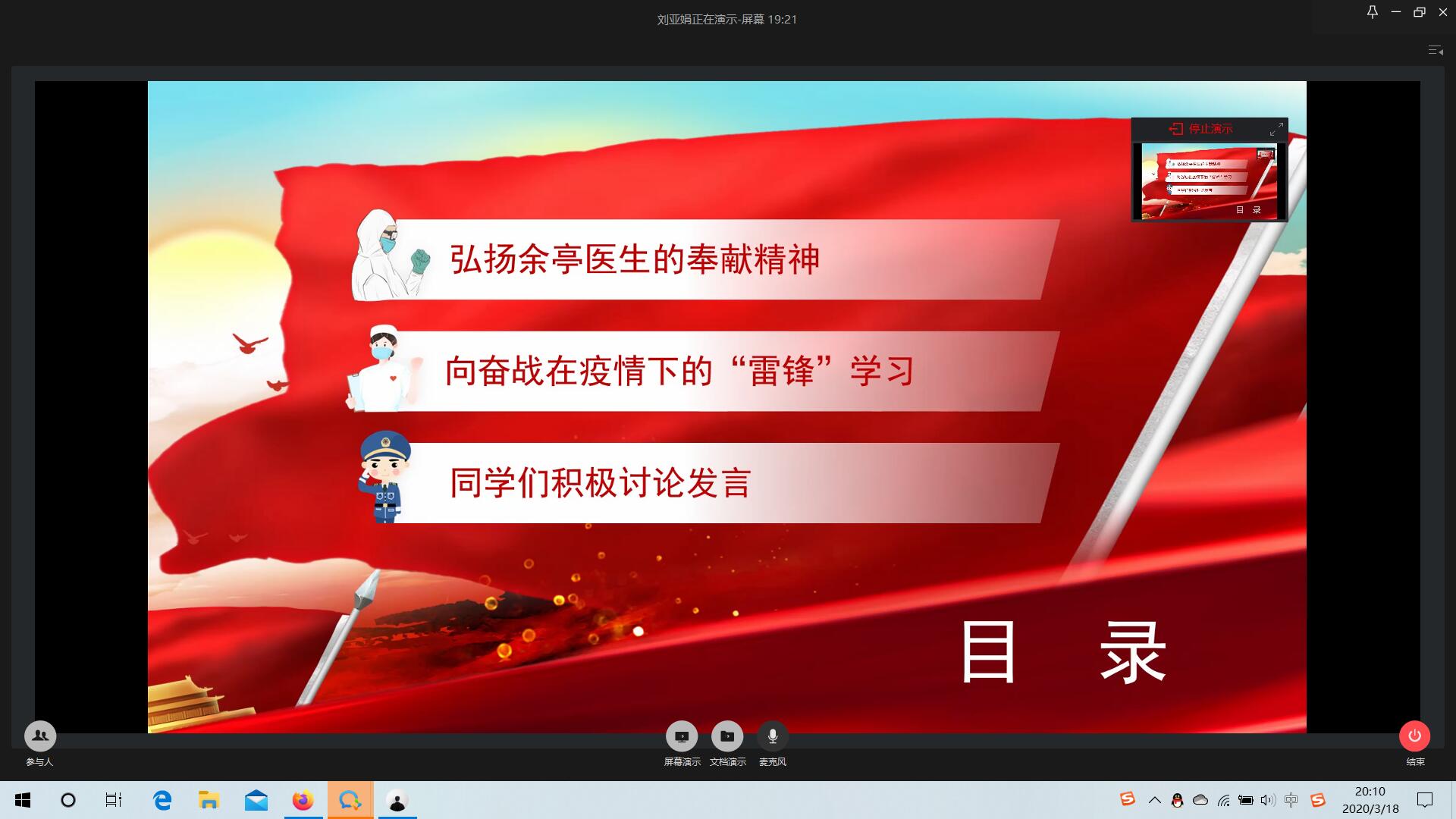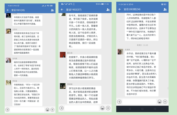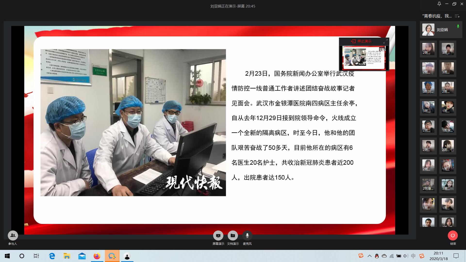 18级团员代表孟子微:作为共青团员,应勇于承担起自己身上的责任,众志成城,抗击疫情。而作为当代青年大学生,更应该不忘初心,牢记使命,抗击疫情,需要我们每个人的努力和贡献,作为新时代的新青年,更是需要自觉担当起时代所赋予的责任和使命,大家众志成城,万众一心,我相信中国一定能够在这场没有硝烟的战斗中赢得胜利。