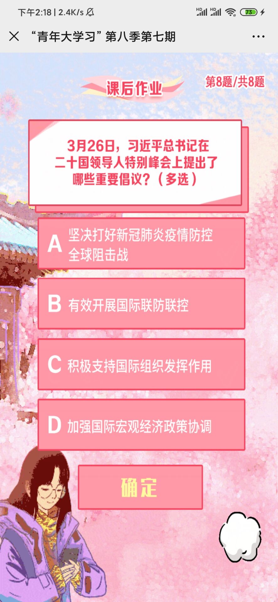 如今疫情在全球范围蔓延,让我们对大家的安全健康深深牵挂。习近平主席在和多国领导人通电通话时,都恳请各国政府采取切实有效措施,保护好中国留学生安全。我国各外交使领馆都把帮助留学生作为目前的首要任务,采取了增设疫情协助热线、实行“零报告”制度、发放“健康包”、组织防疫讲座等举措,竭尽所能保护大家安全。虽然疫情仍在发展,但各国政府已经积极行动起来,特别是3月26日召开的二十国集团特别峰会发出声明,坚定承诺建立统一战线,应对这一共同威胁。我们相信,各国携手抗疫、共克时艰,一定能够迎来胜利的曙光。