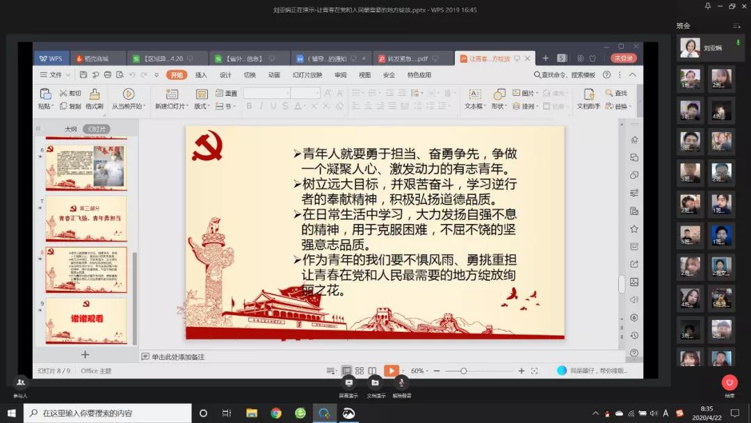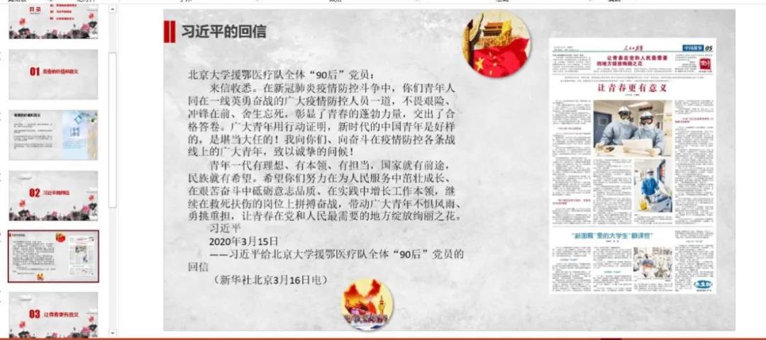 各团支部利用线上网络视频会议,线上集体讨论等学习方式,引导广大青年深入学习以援鄂青年为榜样,同时应做到“四学三做”:要学习抗疫一线人员的爱党爱国精神、无私奉献精神、团结协作精神和勇于担当精神,要做一个爱国有志、有理想有思想、有责任有担当的青年。认真学习习近平总书记给北京大学援鄂医疗队全体‘90后’党员回信,进一步明确当代大学生身上所肩负的重担,并鼓励大家时刻以一名优秀团员的标准来要求自己。