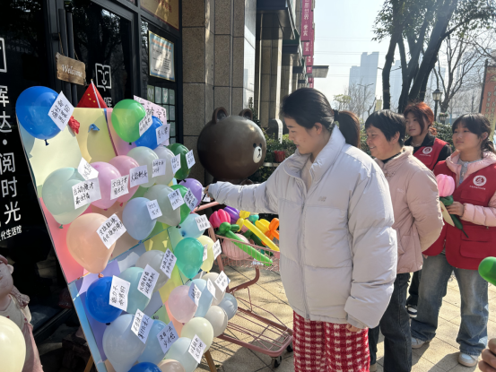 志愿者们在书房内设置了贴满气球的展示板,每个气球上都附着一些对女性的刻板标签。书房的读者可以任选一个气球扎破,象征着打破偏见,并获赠一份由气球编制的精美花束。现场还开展了盲盒抽奖活动,参与者在扎破气球后,能够抽取盲盒,收获充满温暖与鼓励的小纸条。这些活动以多样的方式传递出深刻的理念:每个人都不应被刻板定义,要挣脱偏见的束缚,在各个领域绽放光彩。