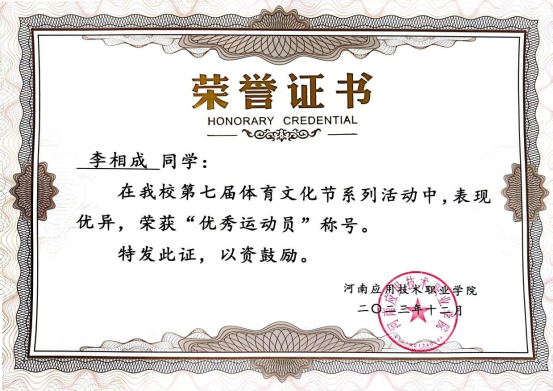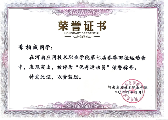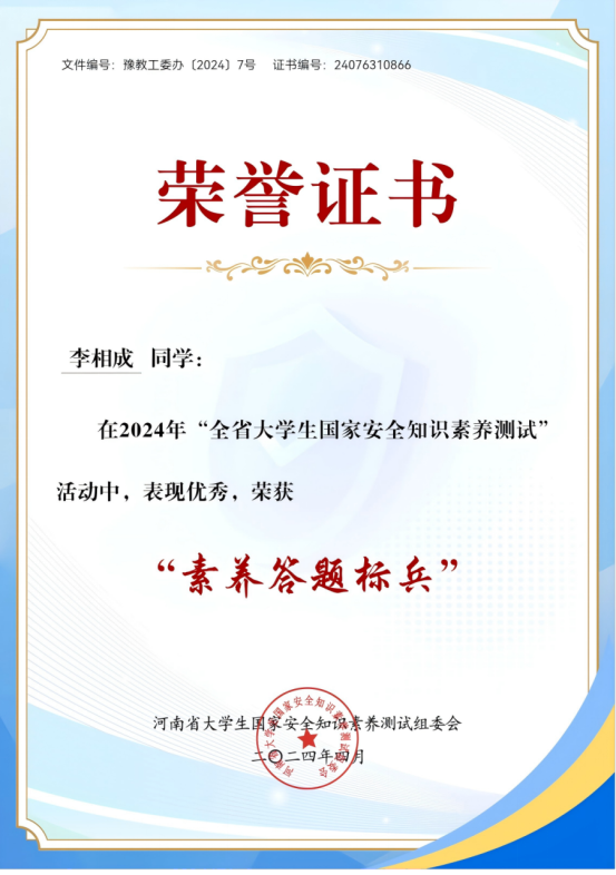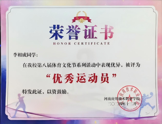 李相成在书山题海中奋勇攀登的同时,还积极投身于milan米兰官网学生工作,凭借出色表现,他在2024年当选“milan米兰官网学生会主席”。任职期间,李相成时刻以身作则,严于律己,用实际行动诠释着责任与担当。他将军旅生涯锤炼出的责任意识与高效执行力注入每一项工作,带领学生会成员积极开展一系列丰富多彩且富有意义的活动。他注重团队建设,经常组织大家进行交流学习,提升团队的综合素质和工作能力。他积极组织各类文体活动,如运动会、文艺晚会等。在他的带领下,学生会成员们团结协作,高效完成了一场又一场活动,为校园文化建设添上了浓墨重彩的一笔,赢得师生们一致好评,荣获“优秀学生干部”称号。