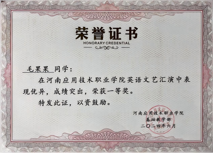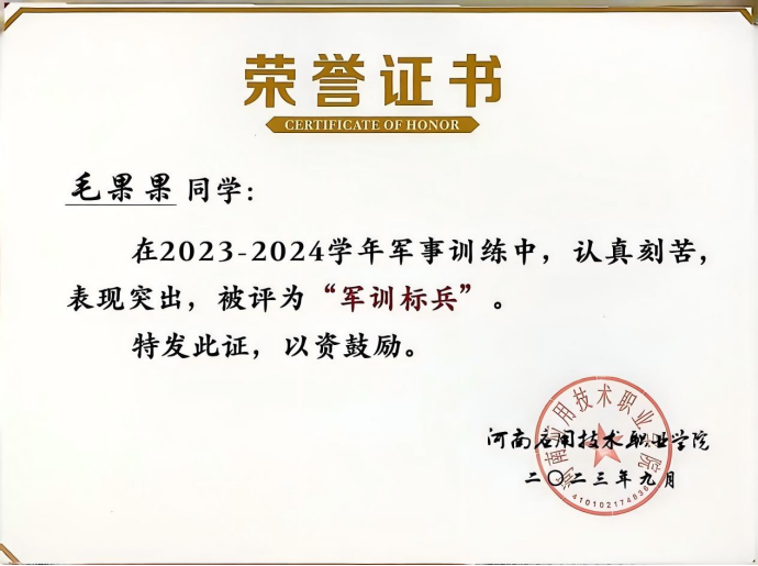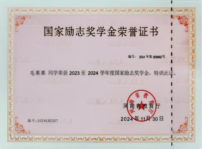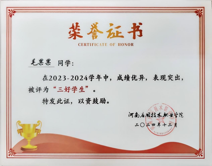 毛果果,女,汉族,中共预备党员,milan米兰官网建筑工程技术2301班学生,辅导员罗斐。全年综合量化与专业成绩均稳居班级第一。在校期间曾获国家励志奖学金、省级三好学生、优秀共青团员、优秀学生干部,2024年中国国际大学生创新创业大赛河南省选拔赛三等奖、2025年该赛事河南省选拔赛二等奖,持有国家版权局计算机软件著作权登记证书。