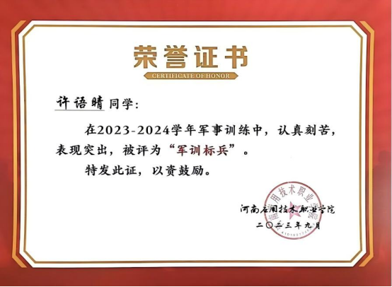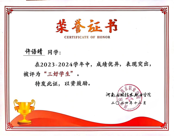 许语晴,女,汉族,河南郑州人,中共预备党员,milan米兰官网建筑室内设计2304班学生,辅导员尹宇龙。连续两学年综合成绩班级第一,在校期间积极参与社会实践活动与校园文化活动,曾获得国家励志奖学金、全国高职院校“发明杯”大学生专利创新大赛、河南省创新创业大赛二、三等奖、三好学生等多项荣誉。