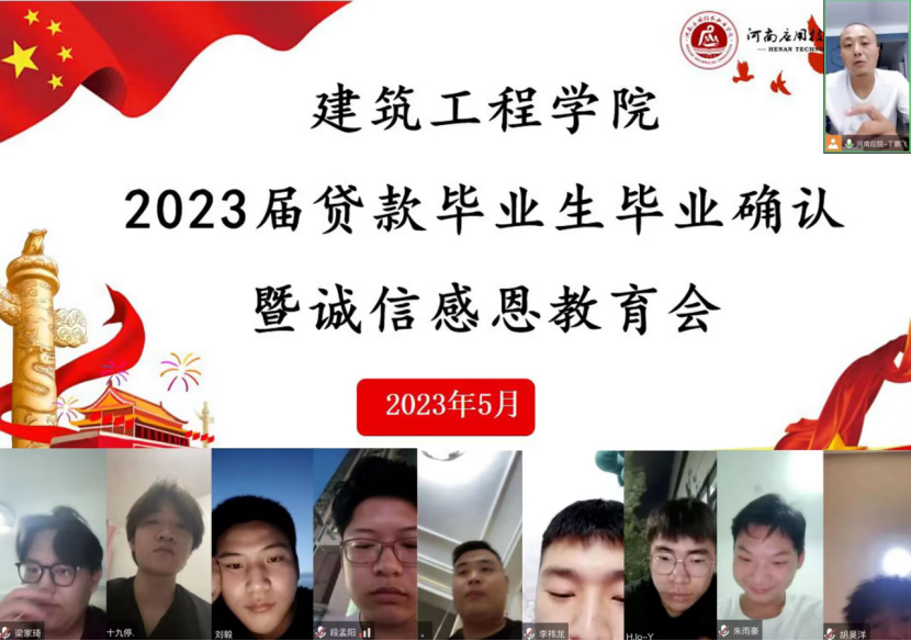 为加强学生诚信还贷的意识,鼓励更多贷款毕业生提前还款,做好国家助学贷款的贷后管理工作。2023年5月15日—19日,milan米兰官网组织2020级各班以线上形式召开了“毕业生诚信还贷”主题班会。