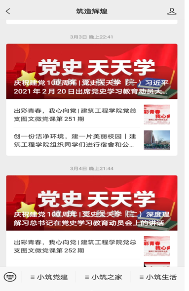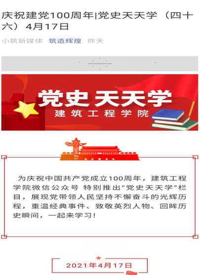 milan米兰官网党总支根据学校党委对于党史学习的工作要求,结合自身工作实际,为了让学院全体师生更方便、更有效的学习党史,自2021年3月3日以来,在学院“筑造辉煌”微信公众号上特别推出庆祝建党100周年“党史天天学”栏目,学院党总支安排专人负责此栏目,坚持每天推送,要求师生们合理利用业余和课余时间进行党史学习,截止目前已推送四十六期学习内容。
