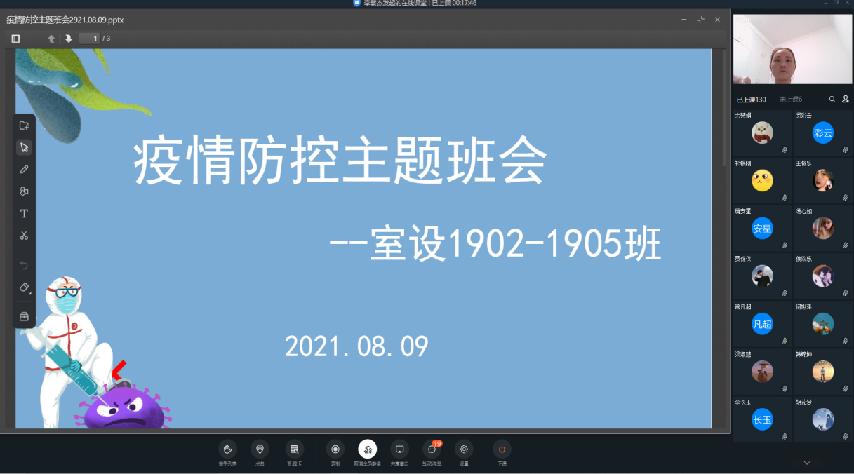 当下国内多地疫情防控形势严峻复杂,为增强我院学生疫情防控意识,贯彻落实学校对疫情防控的要求,进一步做好疫情期间学生的管理工作.在milan米兰官网党总支书记马春燕的安排部署下,各班辅导员、班主任组织召开了线上疫情防控安全教育主题班会。