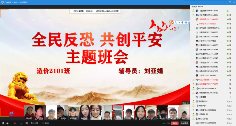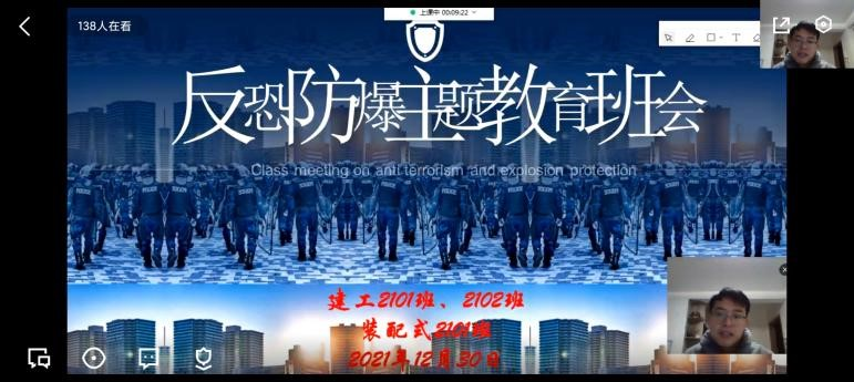 各班级班会通过线上形式学习《中华人民共和国反恐怖主义法》相关知识、观看反恐安全知识视频。并通过国际上的恐怖袭击案例来为同学们讲解了恐怖暴力的手段表现、反恐防暴相关法律法规、反恐防暴应对措施以及受伤后的自救方法等内容。各班级辅导员围绕班会主题,给同学们讲解了公民安全防范常识,如何对暴力恐怖犯罪线索进行举报等反恐怖常识,及一些应对暴力恐怖袭击的原则和应对策略。针对同学们的实际情况,共同总结与分析面对紧急事件的方法,重点强调了如遇到砍杀袭击、纵火、爆炸、枪击、劫持等暴力袭击事件时,应第一时间报警并寻找安全位置,不围观、不靠近,并一定要保护好自己;如遇可疑人跟随,一定要避免走无人的小巷,并迅速到就近的派出所报警。