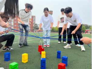 在活动开始前,各队成员积极沟通,交流想法。面对建塔过程中可能出现的问题,团队成员共同思考和探索解决方案。在裁判的一声“开始”令下,同学们保持冷静,眼神专注,合力操纵绳子,用钩子将盒块吊起来,并通过调适力度来控制钩子,慢慢将盒块运输至指定位置。有的队伍在即将完成建塔之际,最后一块盒子突然掉落,但依然稳住心态,毫不放弃,最终顺利完成建塔任务。