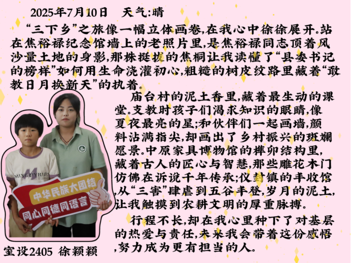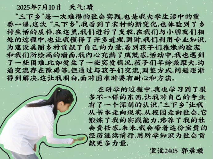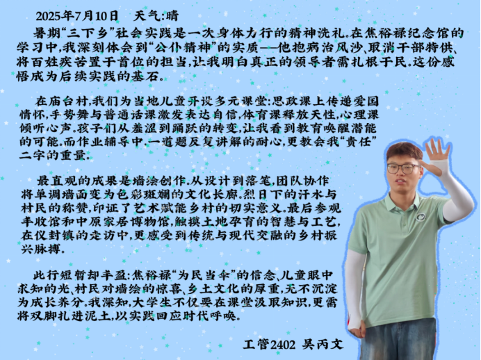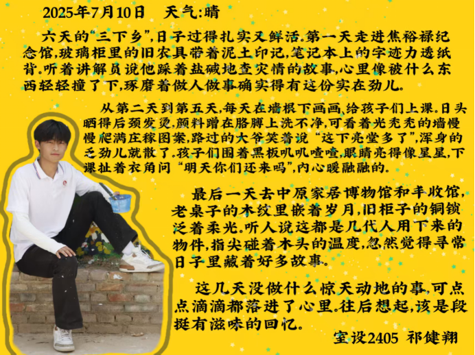 milan米兰官网“小筑”志愿服务队暑期“三下乡”社会实践的余热尚未褪去,队员们带回的不仅是兰考大地的风尘,更有浸润在乡土里的思考与成长。从支教课堂上的童真互动,到墙绘现场的协作攻坚,从博物馆里的古今对话,到与村民攀谈时的质朴共鸣,不同的实践场景里,藏着同样滚烫的收获。让我们继续倾听他们在乡土间播撒青春、收获感悟的故事。