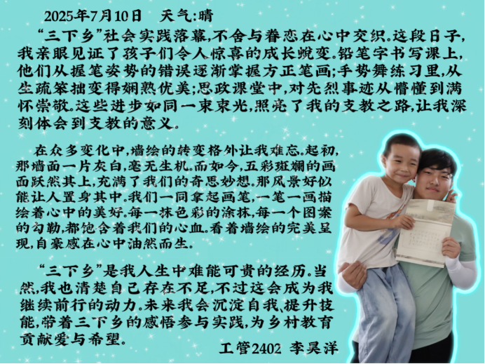 这些来自实践一线的心声,是青春与乡土碰撞出的火花,是理论与实践交融后的顿悟。无论是对专业价值的再认识,还是对责任担当的深体会,都让“三下乡”的意义超越了旅程本身。当这份经历化作前行的底气,当乡土的温度融入成长的轨迹,建工学子们终将带着这份赤子之心,在“建证美好中国”的路上,把每一份感悟都变成脚踏实地的力量,让青春在服务社会的实践中绽放更持久的光芒。
